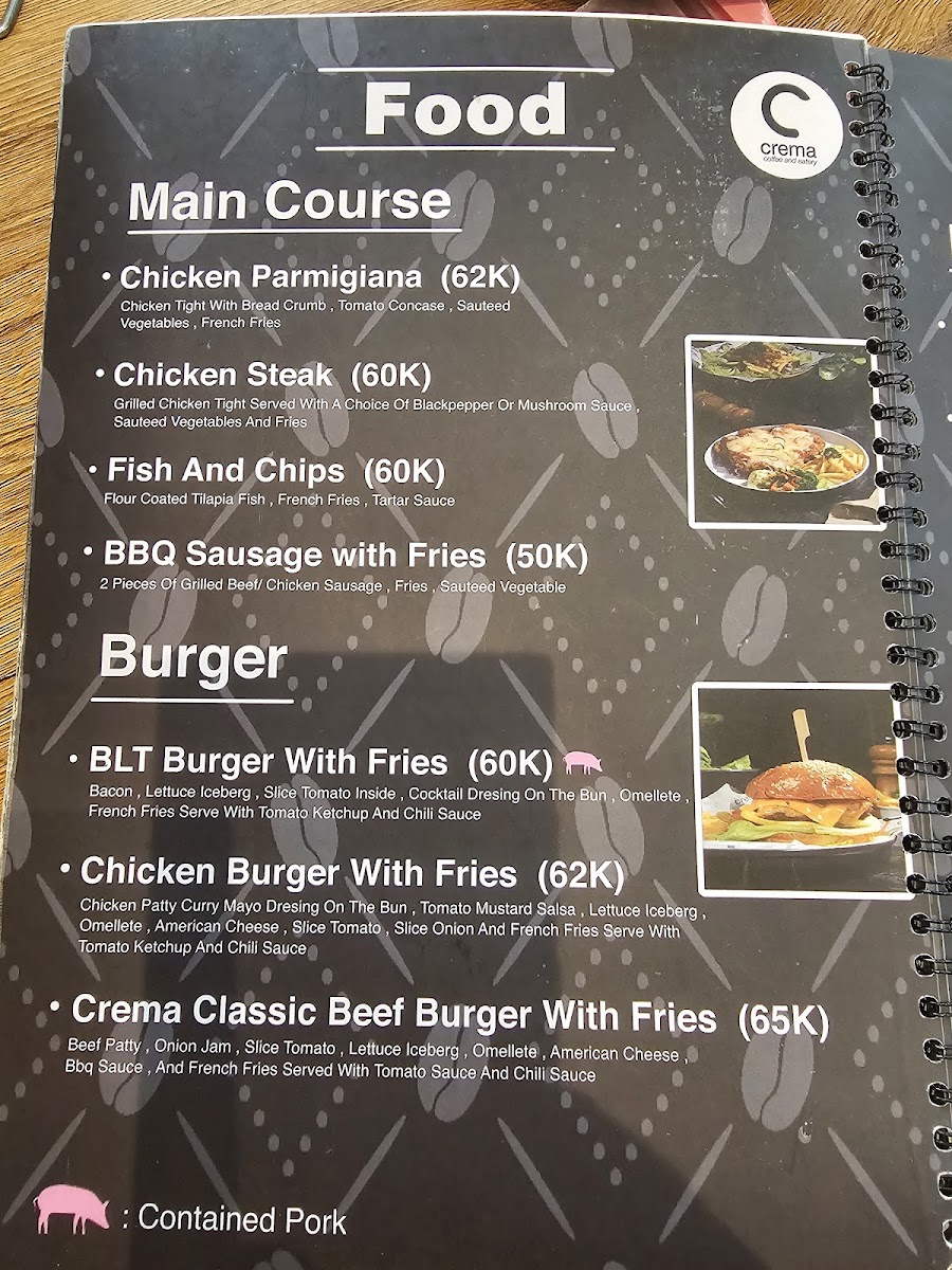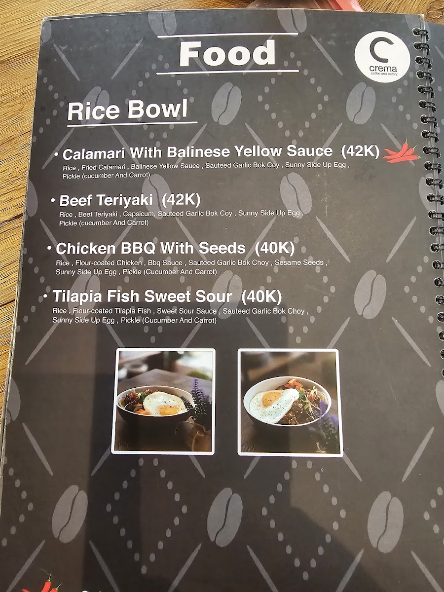 The menu at Crema Coffee and Eatery features a variety of offerings suitable for breakfast, coffee breaks, and light to casual dining. Visitors can find a selection of hot and cold beverages including coffee specialties such as Flat White, lattes, and hot tea, alongside freshly squeezed juices. The food menu includes options for light meals and snacks, with dishes like vegetable fried rice, calamari with Balinese yellow sauce, chicken steak with fries, and sesame chicken. Pastries and baked goods such as chocolate croissants, cinnamon rolls, and red velvet cake are also available.